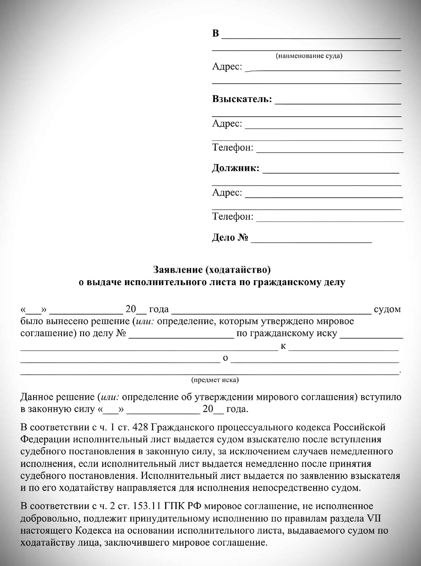 Заявление о выдаче исполнительного листа составляется в произвольной форме, но должно содержать определённые сведения: