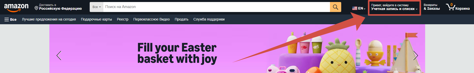 Наведите курсор на кнопку «Account & Lists» (Учетная запись и списки) в правом верхнем углу.