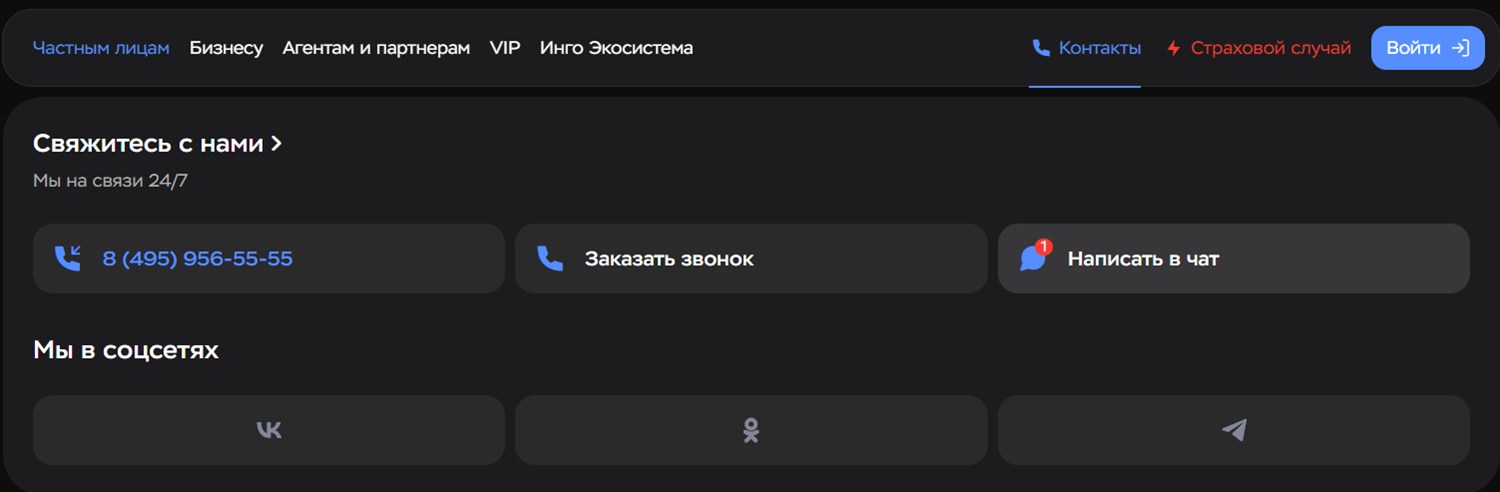Горячая линия у Ингосстраха – универсальная, поэтому вы можете звонить на нее по любым вопросам: от расчета стоимости страховки до экстренного вызова при страховом случае. Если вопрос требует немедленного решения – сразу звоните на горячую линию, номер которой мы дадим ниже; если же вопрос – не острый, то у вас появляются дополнительные опции: чат на сайте, соцсети, приложение, электронная почта, форма обратной связи.