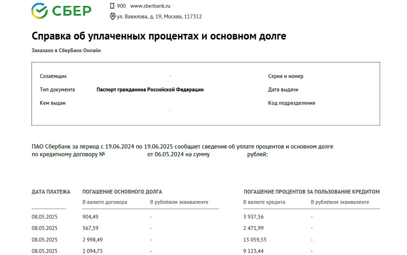 Строгой формы для справки не предусмотрено. Ее оформляют на бланке, который составляется по собственным регламентам Сбера. При этом справка о выплаченных процентах по ипотеке обязательно включает данные: