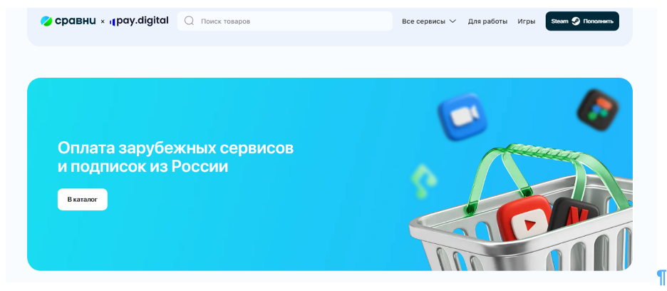 Финансовый агрегатор Сравни предлагает услуги по оплате зарубежных сервисов и подписок.
