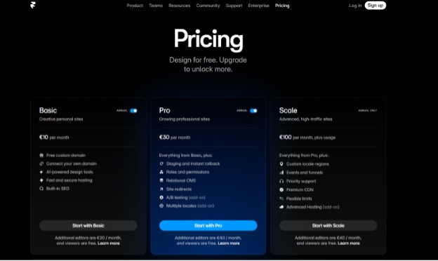 Бесплатный план дает возможность протестировать сервис, но для реальной работы его не хватает: нельзя подключить свой домен, ограничены страницы, CMS и трафик. Платная подписка открывает все профессиональные инструменты.
