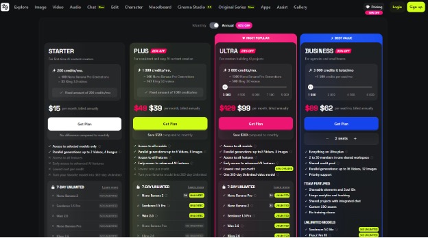 Оптимальным по соотношению цены и возможностей считается тариф Plus за $39/месяц при годовой оплате. Это лучший баланс для большинства пользователей, в том числе для создания коммерческого контента.