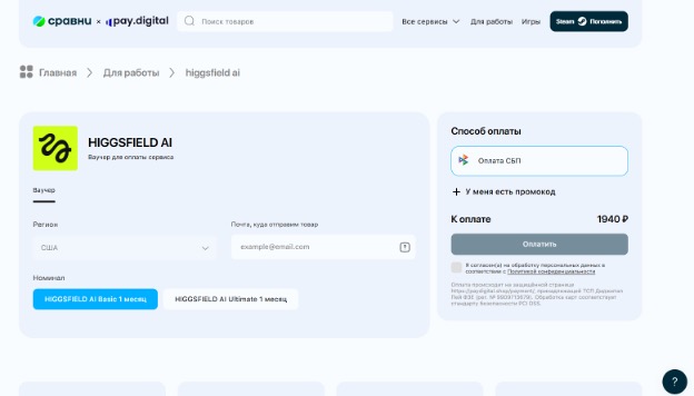 Один из таких надежных сервисов — Сравни. Здесь можно оплатить практически любой зарубежный сервис, включая Higgsfield.