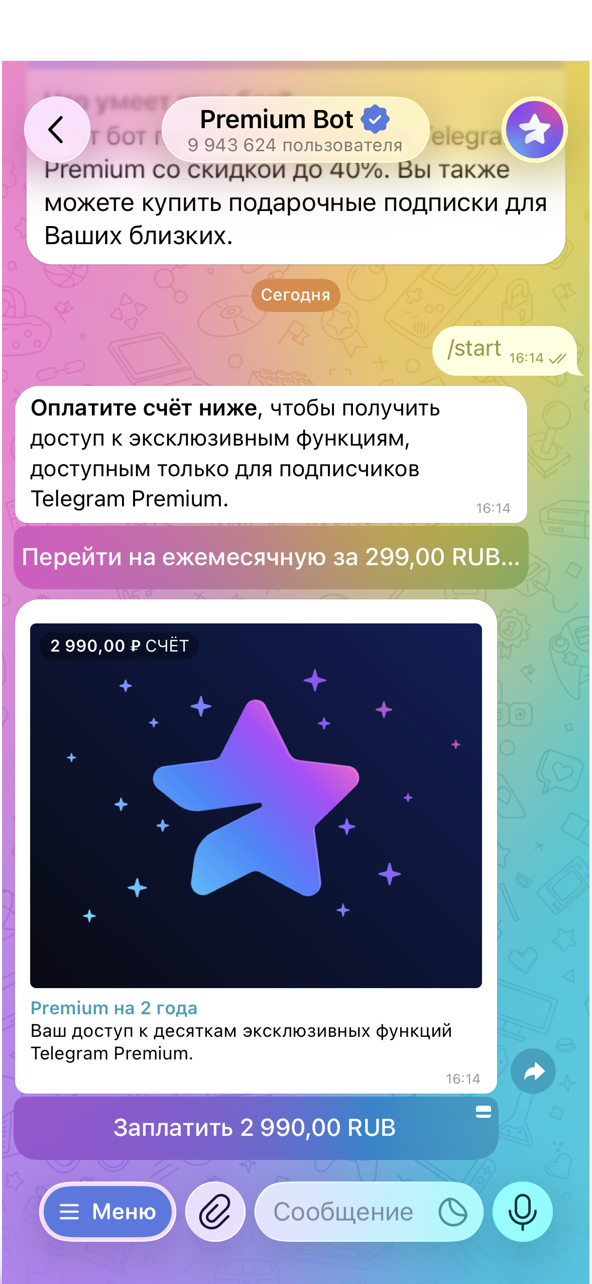 Самый доступный по цене вариант – оформить подписку через официальный бот @PremiumBot. Telegram напрямую объясняет разницу в стоимости. При оплате через бота не закладывается комиссия магазинов приложений, поэтому итоговая сумма получается ниже, чем в App Store или Google Play. Через бота можно подключить подписку себе или отправить ее в подарок другому пользователю.