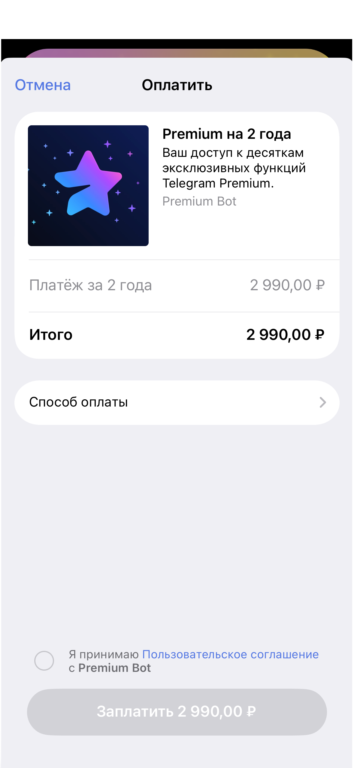 Оплатите через десктопную версию Telegram или через веб-версию, через App Store с зарубежной картой или оформите покупку в @PremiumBot |