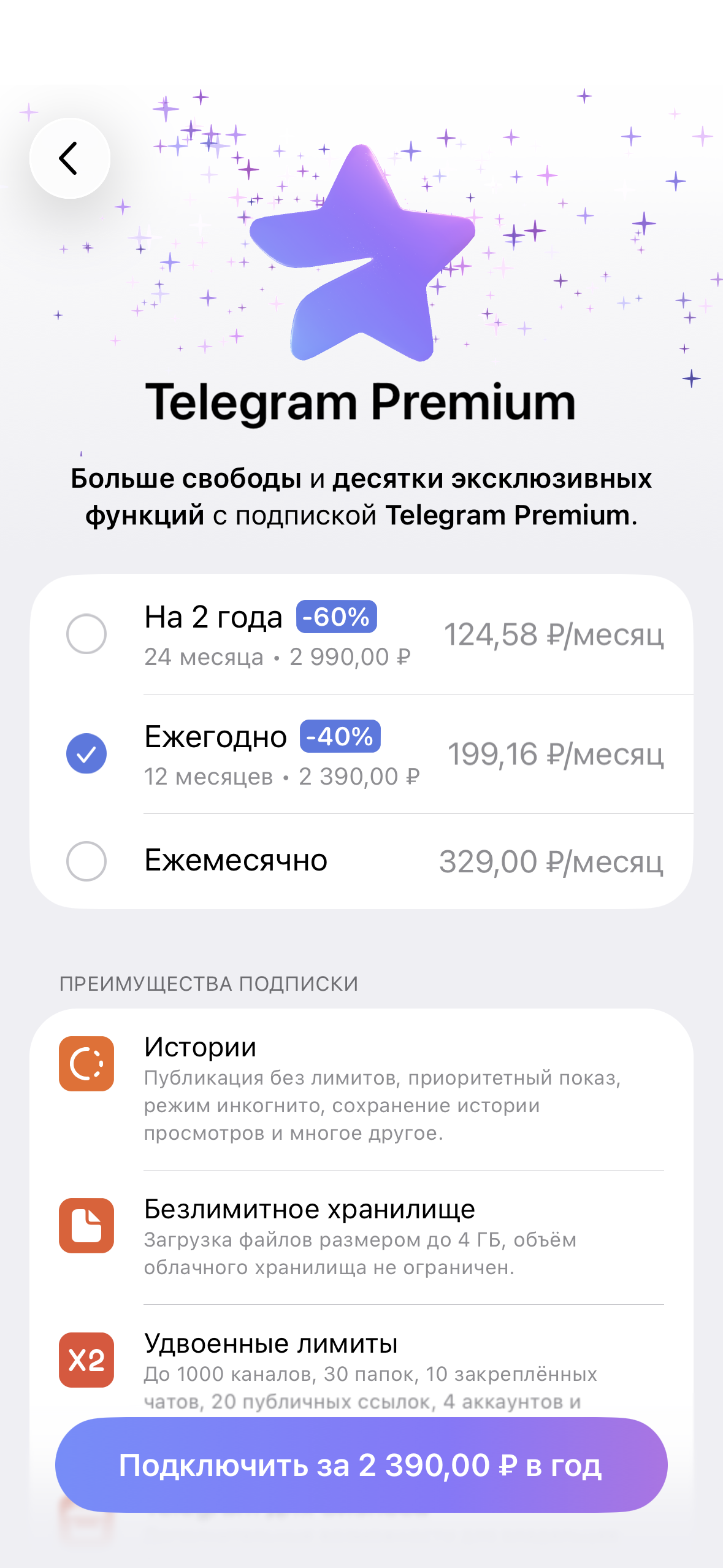 Из минусов стоит учитывать два момента. Во-первых, для российских пользователей потребуется доступный способ оплаты. Это может быть, например, зарубежная или виртуальная карта, так как отечественные не принимаются. Во-вторых, цена подписки через магазины приложений выше, чем при оплате напрямую через @PremiumBot.