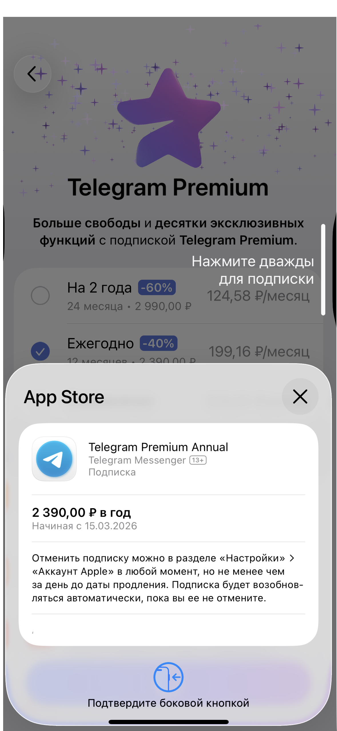 Оформить подписку Telegram Premium можно прямо внутри приложения через магазины App Store или Google Play. В этом случае механика стандартная: платеж списывается с карты или баланса, привязанного к Apple ID или аккаунту Google.
