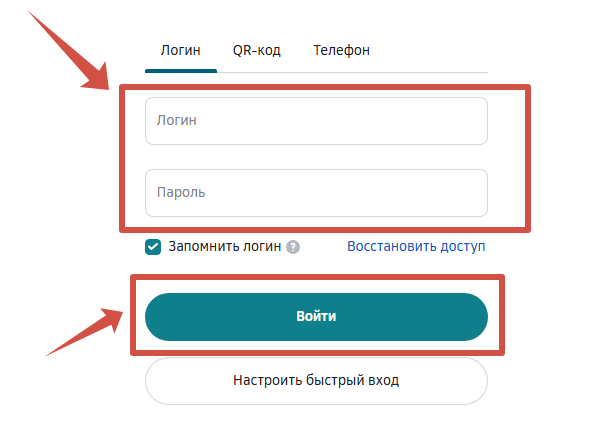 Войти в личный кабинет можно не только с помощью логина и пароля, но и отсканировав QR-код или введя номер телефона, привязанный к аккаунту. Далее действия аналогичны входу по логину и паролю.