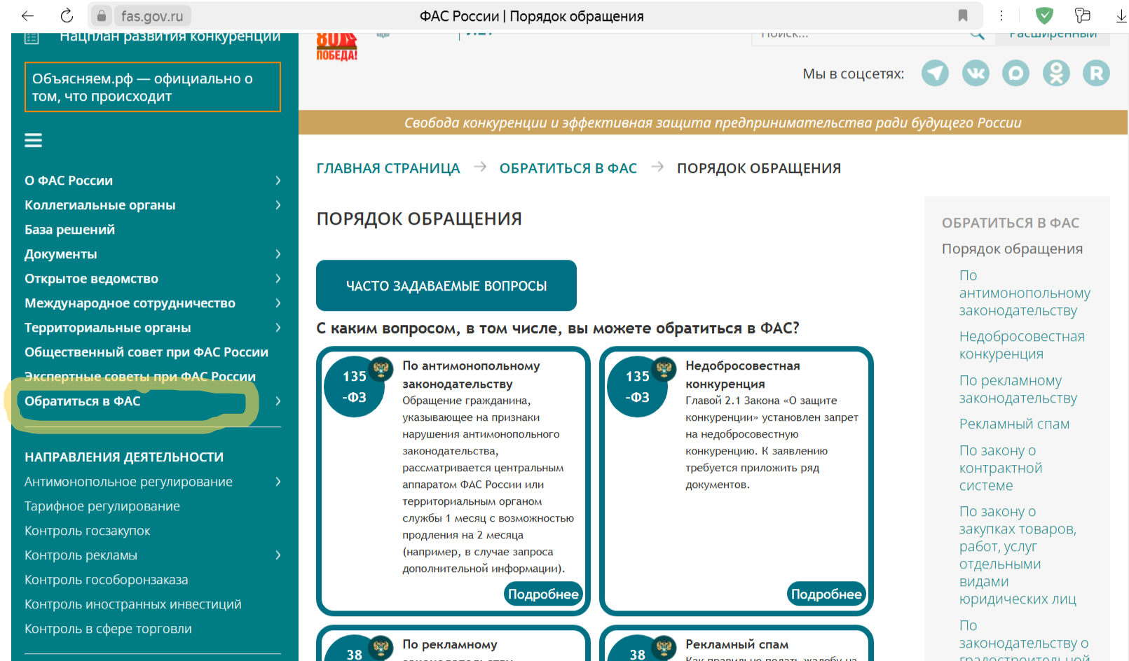 Полную информацию можно найти на официальном сайте антимонопольной службы в разделе «Обратиться в ФАС».