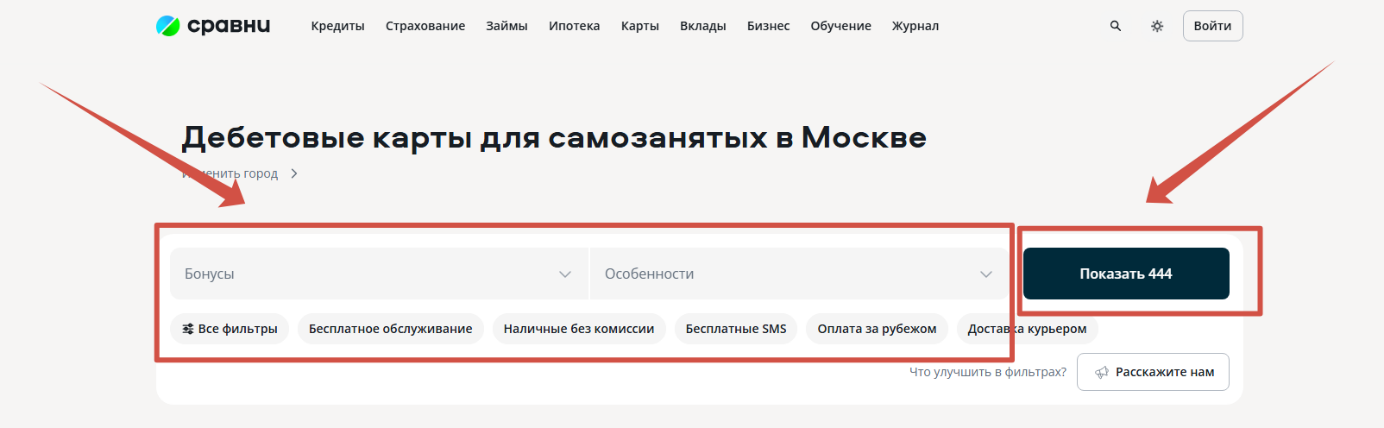 Перейдите на сайт Сравни в раздел карт для самозанятых.