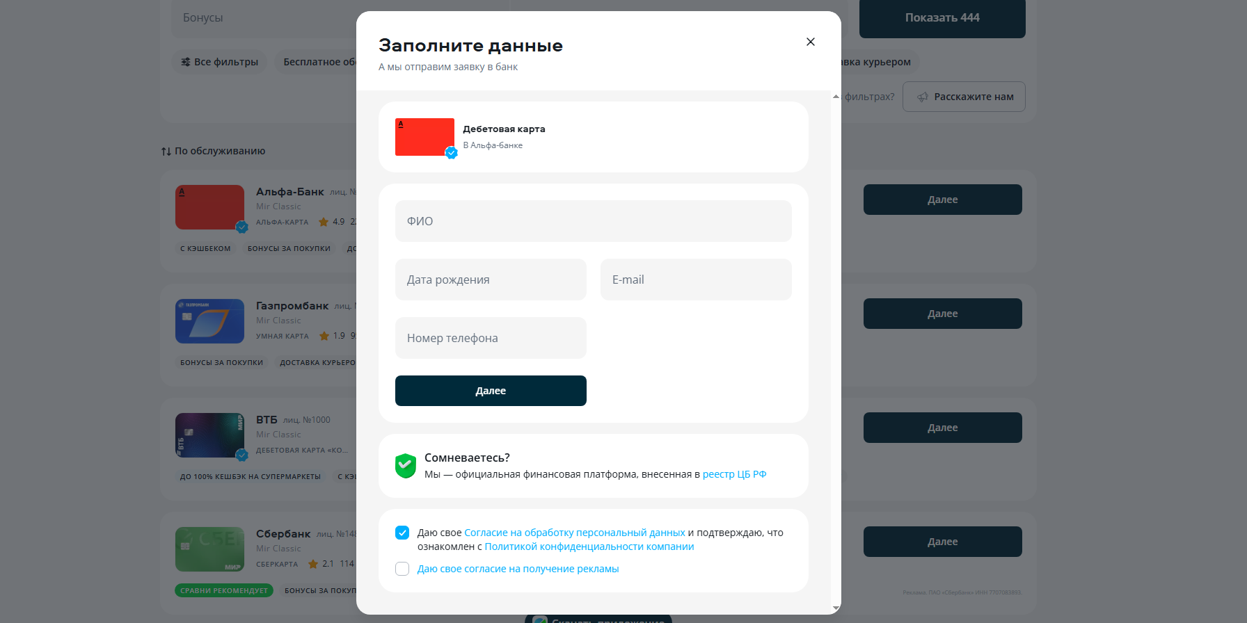 Заполните анкету: укажите ФИО, паспортные данные, контактную информацию (телефон, email).