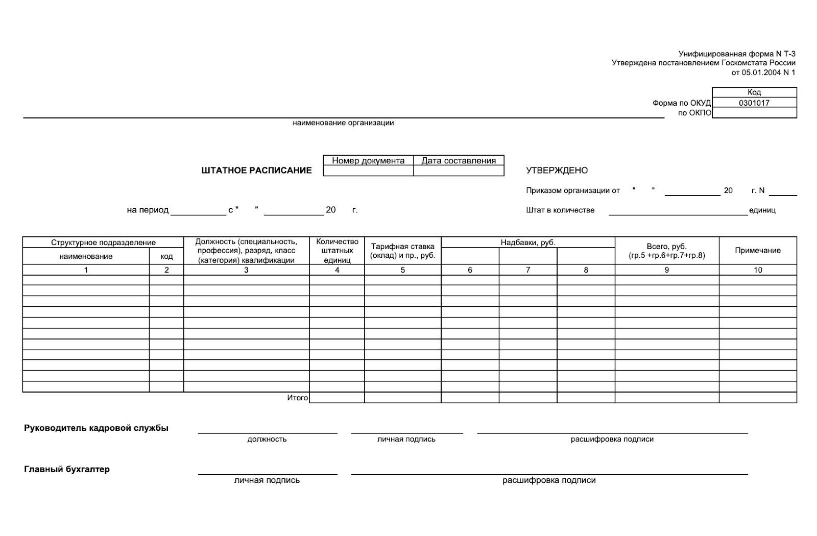 Разработка штатного расписания проводится кадровой службой совместно с экономическими службами и бухгалтерией. Составляется детальная структура подразделений, определяется круг должностей и рассчитывается необходимое количество сотрудников. Хотя универсальной формы нет, чаще всего используют форму № Т-3, рекомендованную постановлением Госкомстата РФ от 05.01.2004 №1. Но каждая компания вправе утвердить собственную версию документа, сохраняя необходимую информацию.