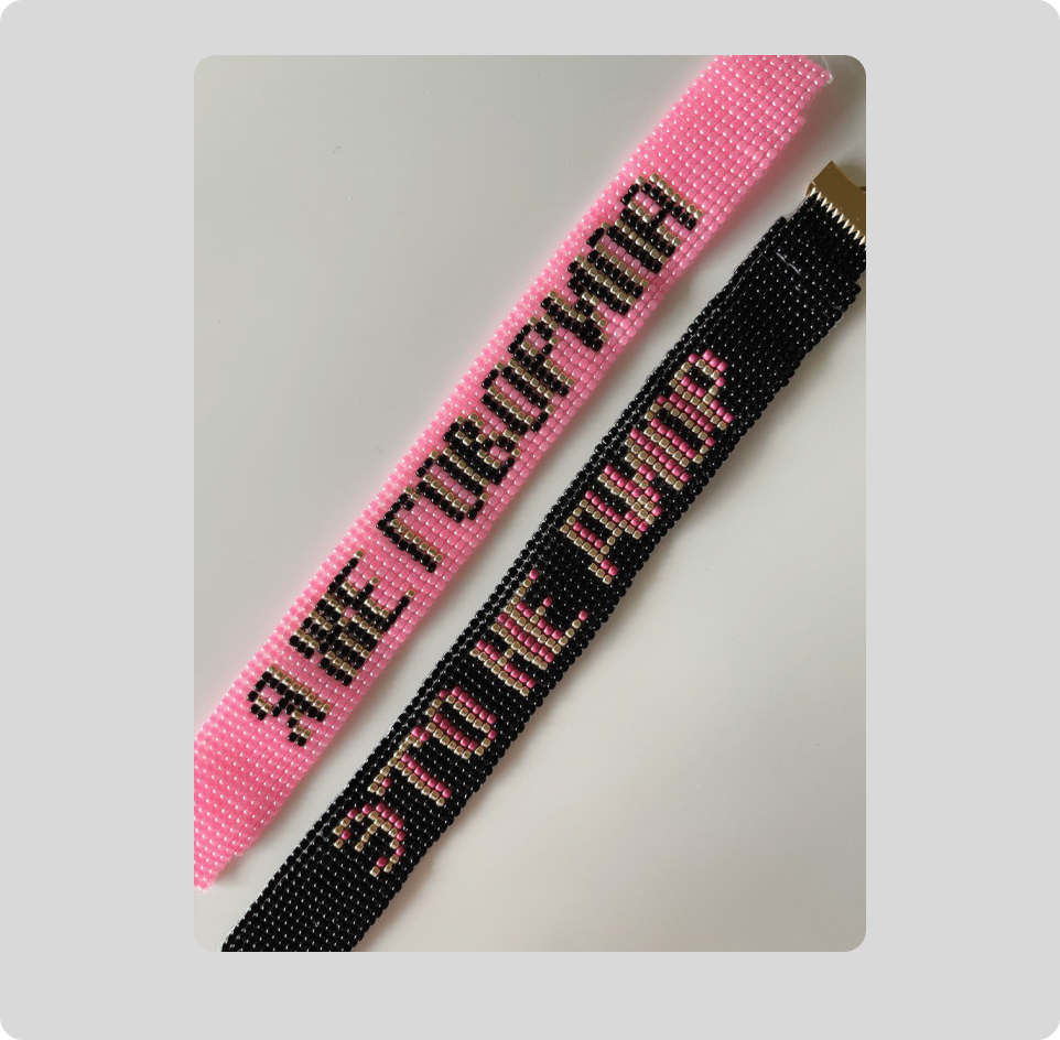 Первые браслеты были довольно простыми, я их раздавала и дарила. А потом мне захотелось сплести что-то большое. Я сделала маску из бисера, просто из интереса. Потом начала делать тканые браслеты из бисера — такие, в которых можно плести интересные узоры и надписи.