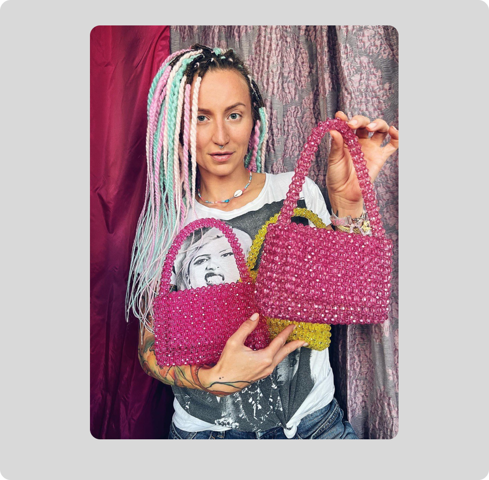 Цена для каждого изделия у меня индивидуальная, она зависит от размера вещи, от времени, затраченного на работу, и от качества бисера. Обычно я использую японский бисер, он стоит раз в десять дороже китайского, зато намного качественнее. Браслет стоит около 2000 ₽, чокер — около 4000 ₽, сумка — 5000–8000 ₽.