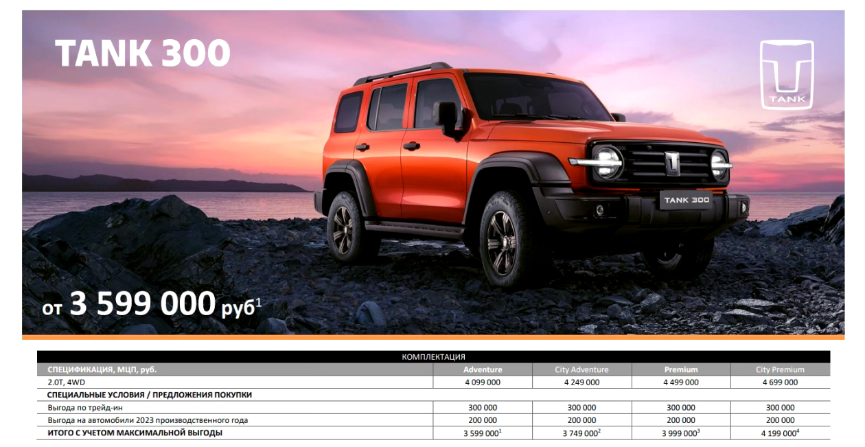 В зависимости от комплектации Tank 300 стоит от 4 099 000 ₽ до 4 699 000 ₽. При этом если сдать старый автомобиль в трейд-ин, можно получить скидку в 300 000 ₽. Если выбрать машину 2023 года выпуска, то дадут ещё 200 000 ₽ скидки. То есть с учётом выгоды Tank 300 можно купить по цене от 3 599 000 ₽ до 4 199 000 ₽.