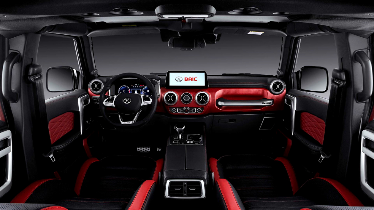 Салон BAIC BJ40 — более классический. Виртуальная приборная панель диагональю 12,3 дюйма имеет солнцезащитный козырёк. Монитор мультимедиа диагональю 10 дюймов возвышается над центральной панелью. Воздуховоды — круглые, а рисунок дефлекторов копирует логотип компании. Между двумя центральными дефлекторами установлена кнопка запуска двигателя и панель управления работой трансмиссии. Ниже находится панель управления климатической установкой.