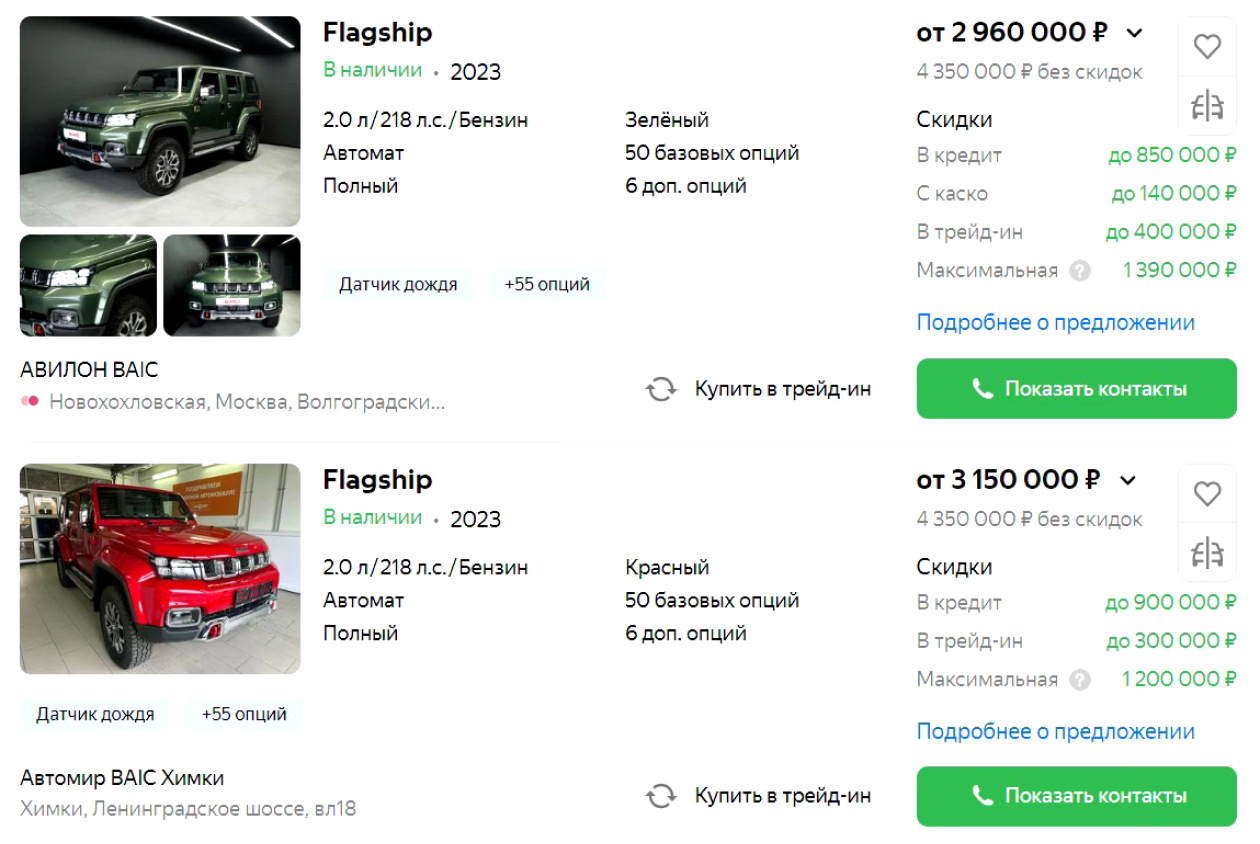 BAIC BJ40 предлагают за 4 350 000 ₽. На официальном российском сайте компании нет специальных предложений и скидок. На площадках по продажам автомобилей можно найти предложения от дилеров. Например, если сдать свою машину в трейд-ин, то дадут скидку в 300 000–400 000 ₽, за приобретение полиса каско — 140 000 ₽, а за кредит — до 400 000 ₽. То есть если воспользоваться специальными условиями, то можно купить BAIC BJ40 за 2 960 000 ₽.