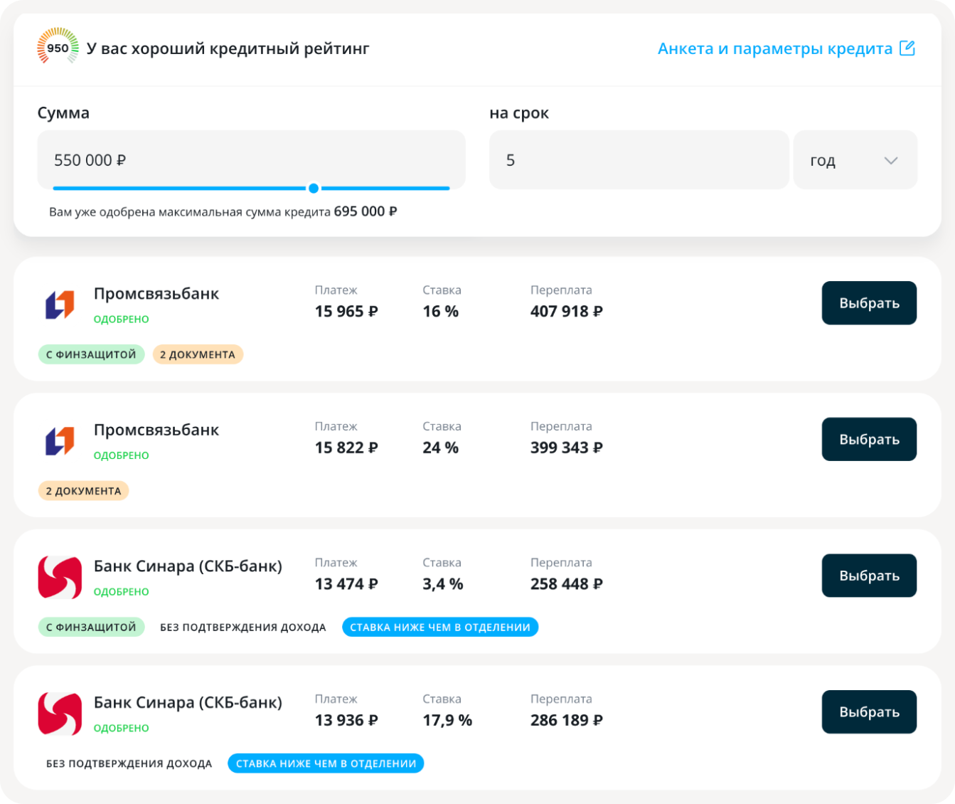 После заполнения анкеты мы покажем предложения разных банков, среди которых можно выбрать наиболее подходящее.