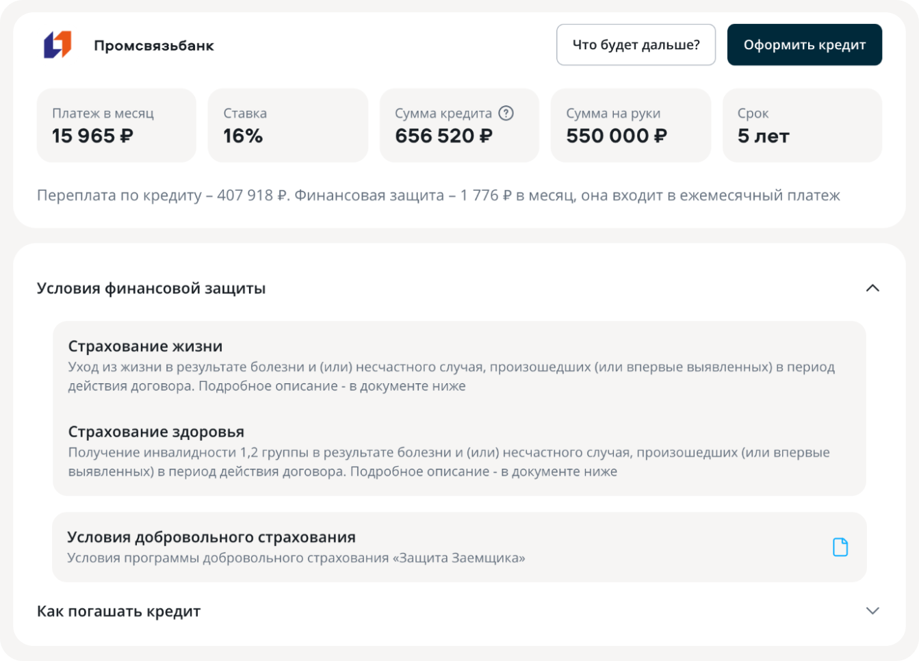 Казалось бы, нужно брать кредит с меньшей переплатой. Но лучше не торопиться и рассмотреть сначала, что за финзащиту предлагает банк, чтобы убедиться в выгоде.