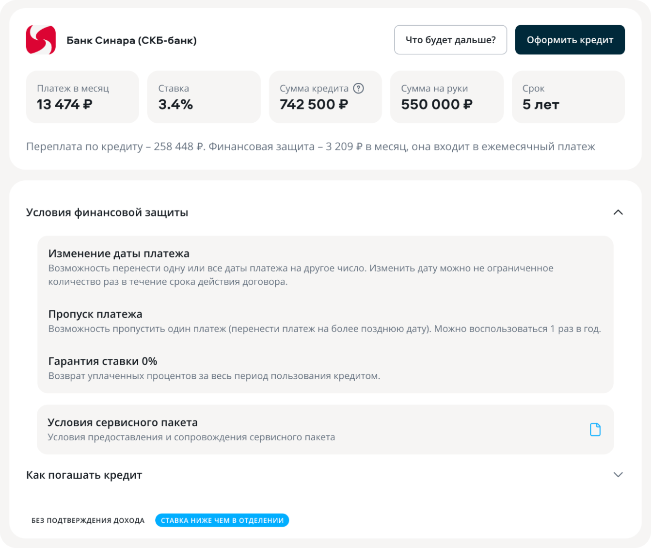 А в банке «Синара», наоборот, переплата с финзащитой ощутимо меньше, чем без неё. И ежемесячный платёж меньше, чем в Промсвязьбанке. Всё благодаря пониженной ставке.
