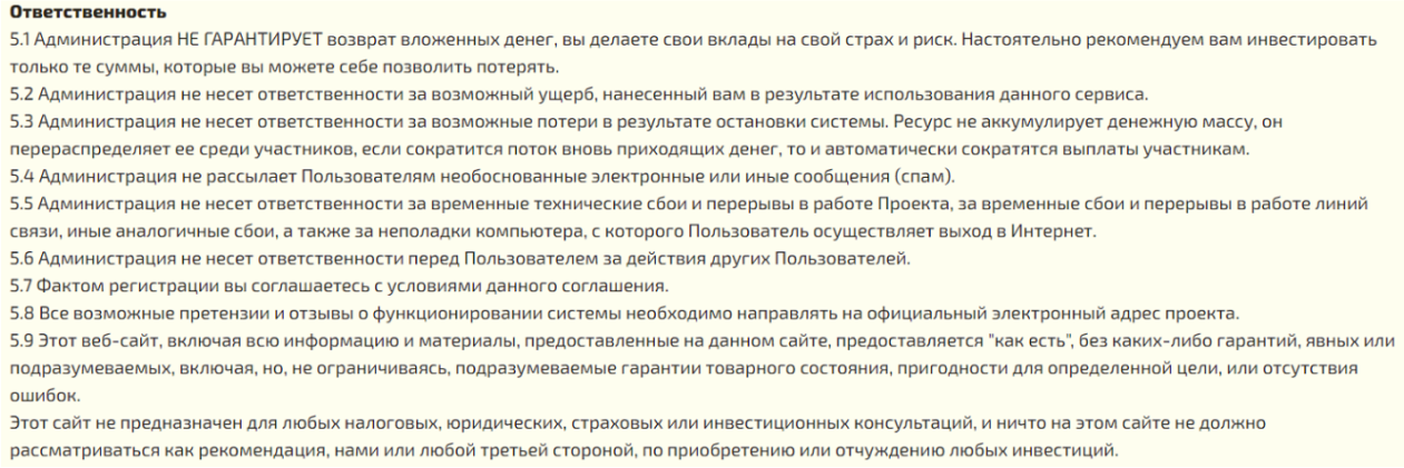 Статистика кажется довольно реалистичной, что для проектов данной «ниши» — очень странно, обычно числа существенно завышены, чтобы проект казался более привлекательным для инвесторов. Как видите, суммы пополнений существенно выше сумм выплат. Если компания, как указано в пользовательском соглашении, не аккумулирует деньги — где находится разница между пополнением и выплатой? Дрейфует в космосе? Кроме того, «работаем 32 дня» не делает проекту чести — надо было дописать хотя бы 1 в начале. Суммы — небольшие, суммы пополнений — существенно больше сумм вывода, хотя выводы случаются чаще, чем пополнения. Правда, есть нестыковочка, которая рушит всю эту красивую таблицу — в пользовательском соглашении написано, что «4.1. Пользователи могут пополнить баланс на сумму от 10 ₽ при помощи платёжной системы Payeer, FreeKassa, Visa, Qiwi, PerfectMoney». Как видите, в таблице есть суммы пополнения на 3–5 ₽, что противоречит правилам площадки — значит, вся таблица врёт.