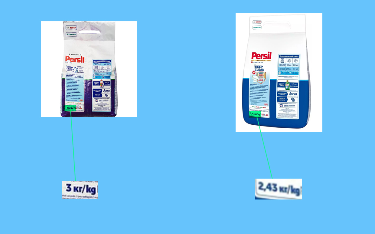 Стиральный порошок сегодня продаётся в пачках по 400 г, 3 кг, 6 кг и даже 14 кг. Причём упаковки, схожие по весу — скажем, 3 кг и 4,5 кг, — часто выглядят одинаково. Так что при выборе нужно внимательно смотреть на ценник и считать стоимость 1 кг, а не пачки. Что касается «потери в весе», то тут наглядный пример — Persil, который продавался в пачках 3 кг, а сейчас можно встретить 2,43 кг.