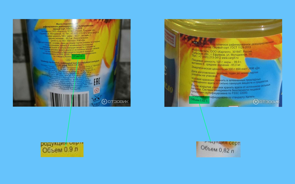 Растительное масло, как и молоко, мы привыкли покупать по литру. Но некоторые производители давно перестроились. Например, масло «Знатное» теперь выпускается в бутылках по 820 мл, а до этого его объём был 900 мл. При этом визуально бутылки почти не отличаются.