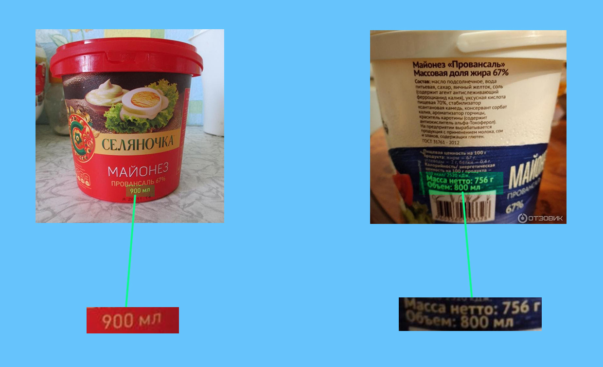 Майонез «Махеев “Оливковый”» в 2014 году был 400 г, в 2021 году — 380 г. «Селяночка» в 2013 году продавалась в ведёрках по 900 г, сейчас — 800 г.
