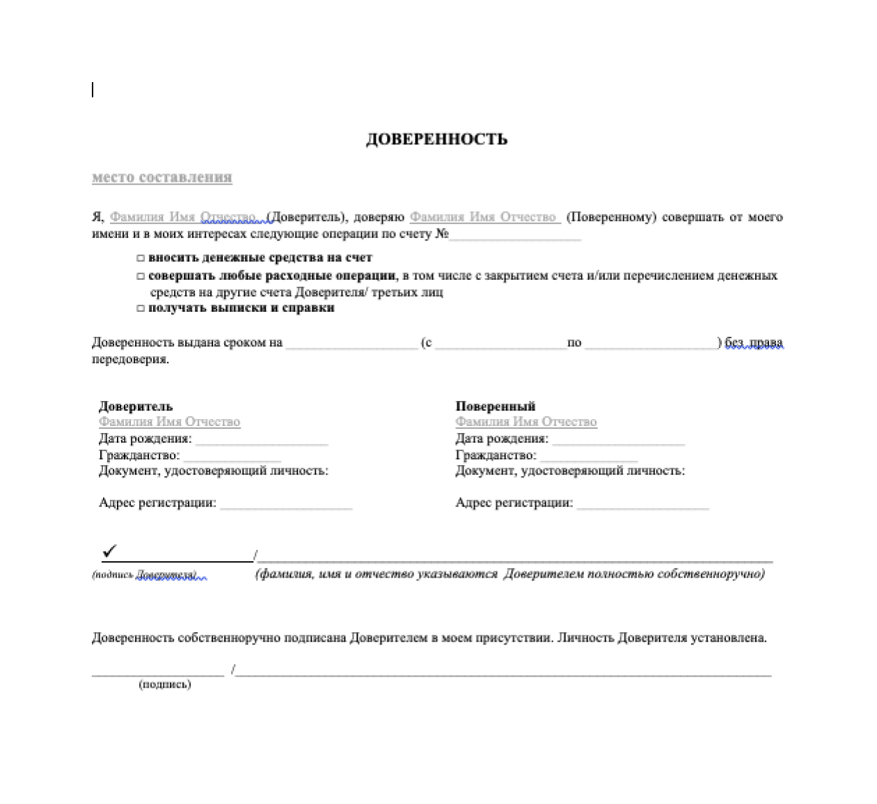 - перечень полномочий — например, право подавать заявление на оформление кредитных каникул, получать банковские справки и выписки, совершать любые расходные операции, в том числе с закрытием счёта и перечислением средств на другие счета доверителя или третьих лиц;