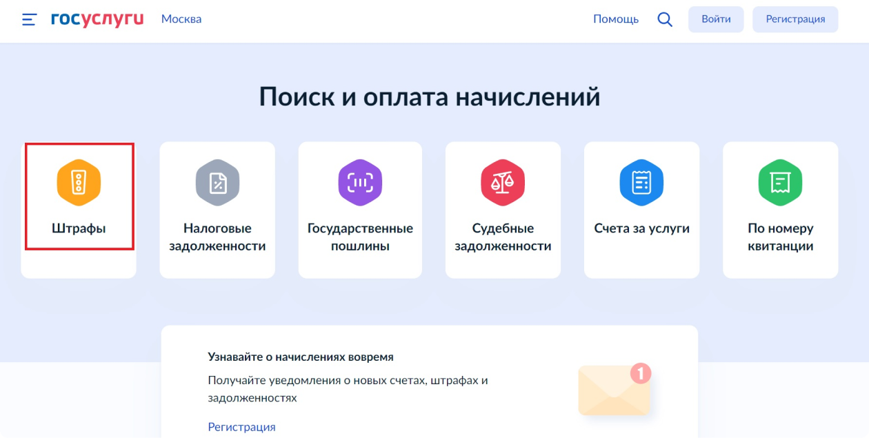 1. Войти в раздел «Поиск и оплата начислений» на Госуслугах и выбрать там пункт «Штрафы».