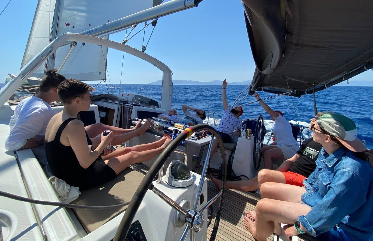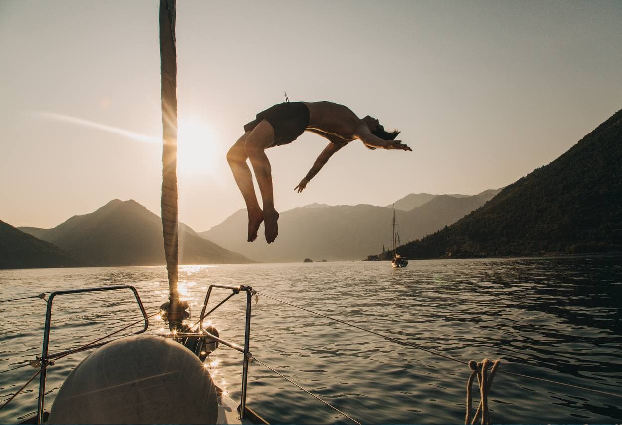 Есть тарзанка, которую прикрепляют к гику — главному парусу на мачте. С неё особенно интересно и красиво прыгать, когда яхта делает дрифт, то есть резко поворачивает на полном ходу. Можно прыгать и с самого гика. И конечно, можно просто плавать.