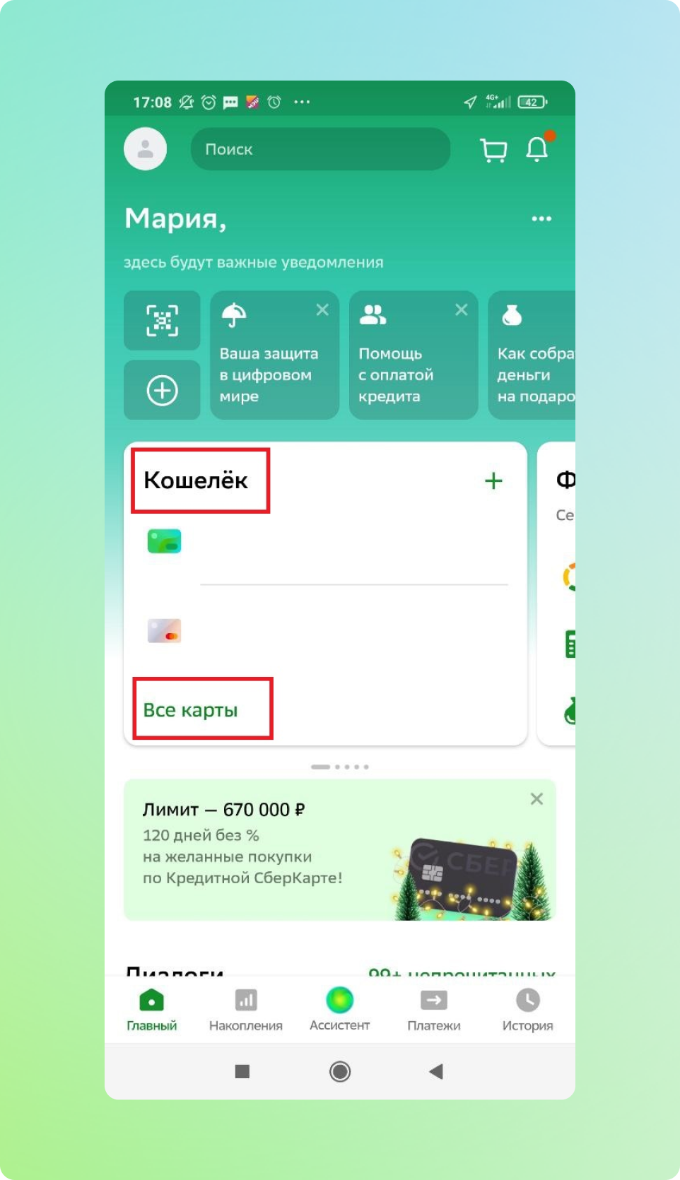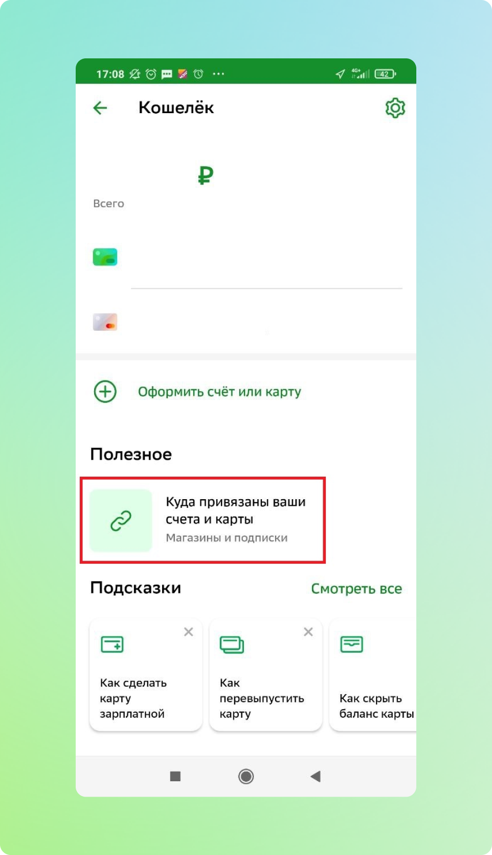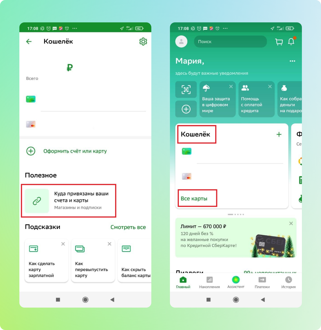 Для этого на главной странице в разделе «Кошелёк» выберите «Все карты», а затем — «Куда привязаны ваши счета и карты».