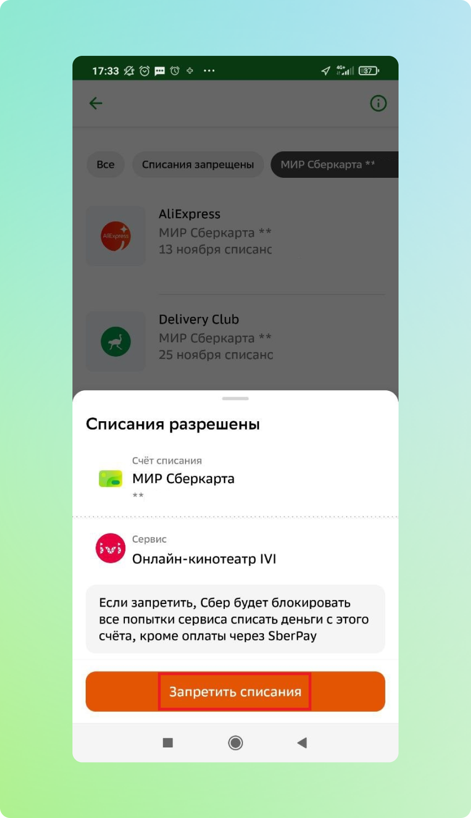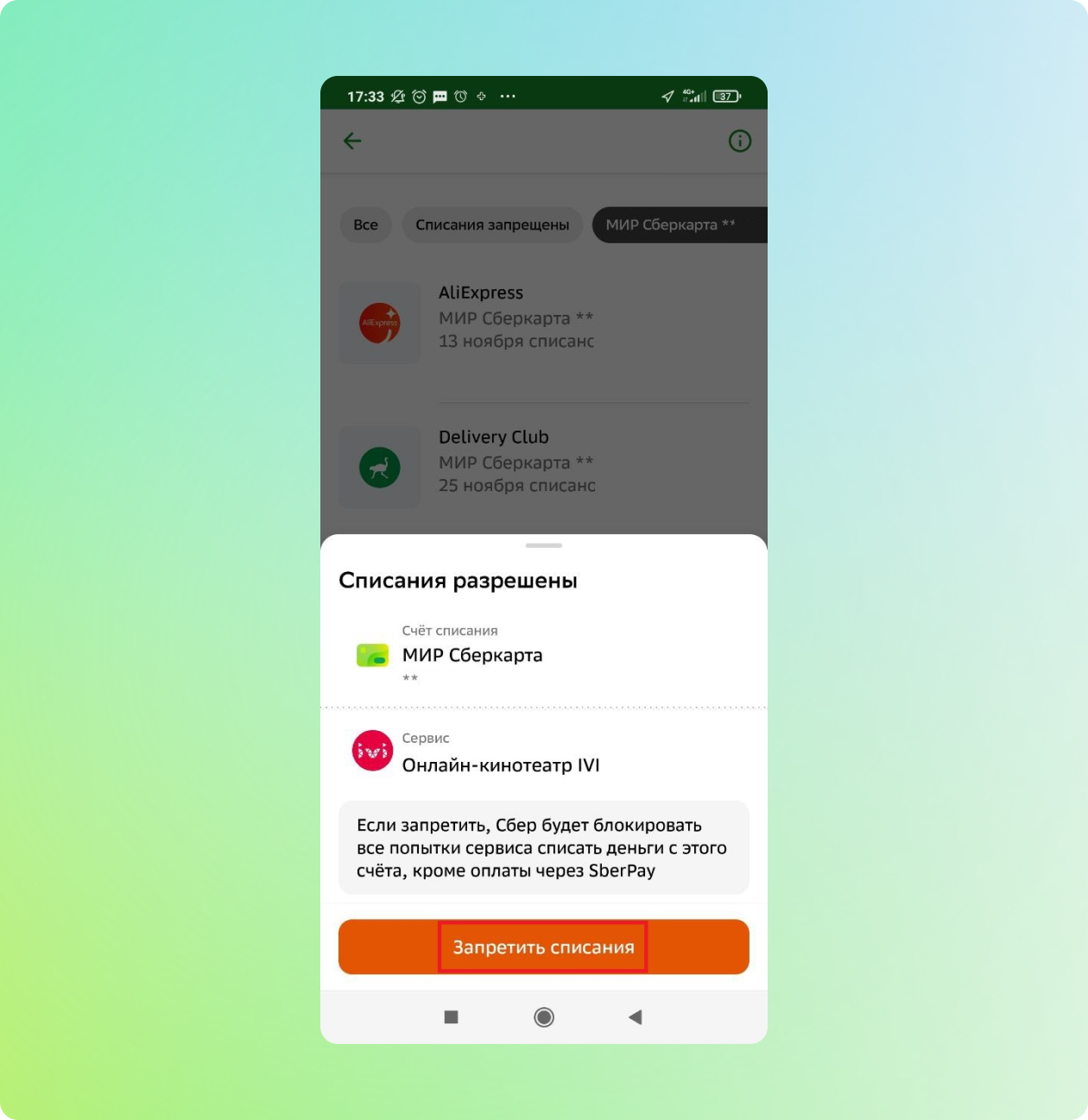 Вы можете просмотреть этот список и, если не хотите, чтобы какой-то магазин или сервис продолжал списывать деньги автоматически, заблокировать его. В любой момент можно разблокировать снова.