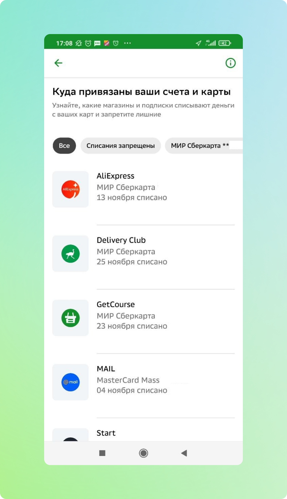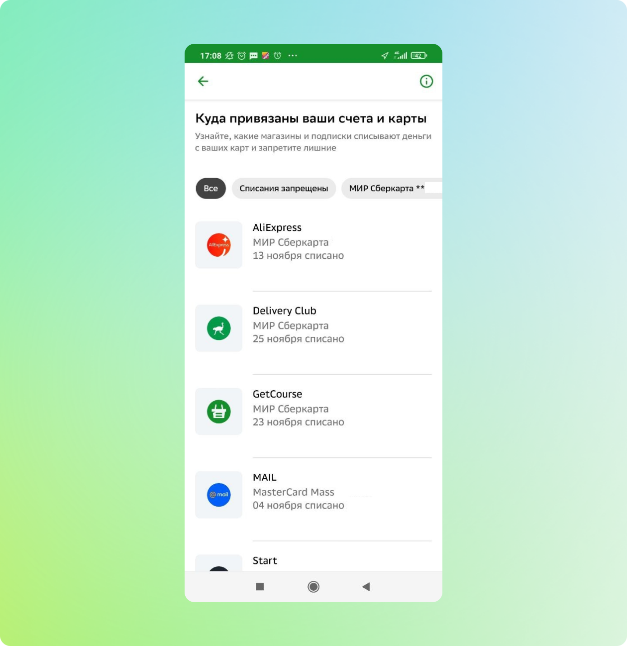 Вы увидите список всех сервисов, где вы платили картами Сбера, и когда происходили автоматические списания.