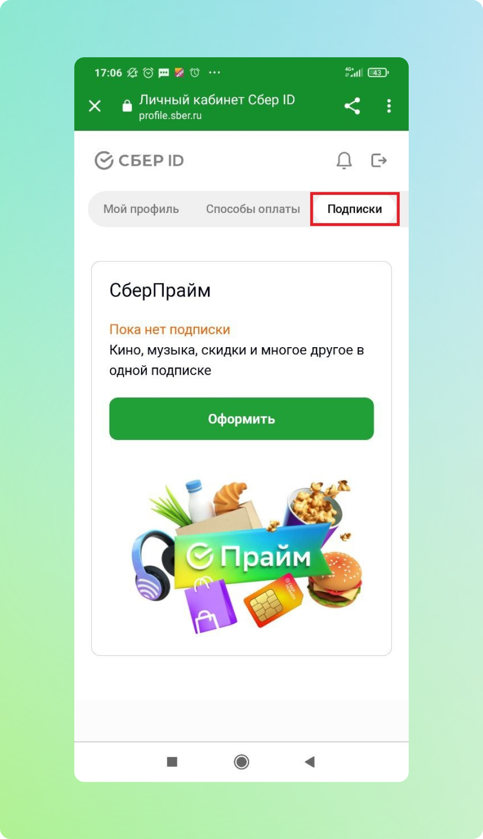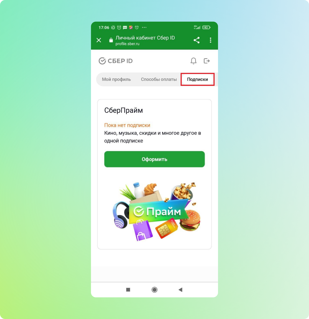 Нажмите «Перейти на сайт личного кабинета», выберите нужную вкладку — и увидите все подписки именно на сервисы Сбера.