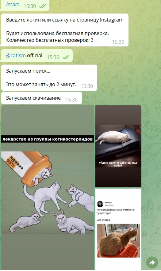 У этого бота – 3 бесплатные проверки. Вводим имя аккаунта или даем на него ссылку, жмем на «Скачать сторис». Получаем искомое:
