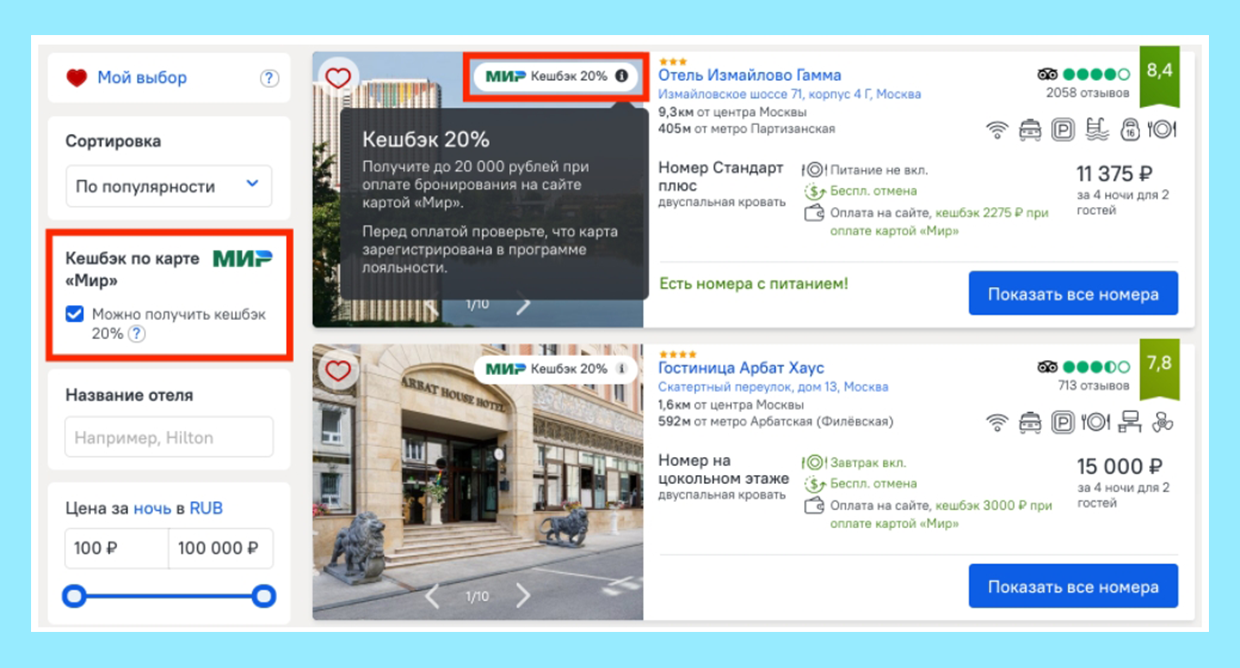 Программа начисления кэшбэка по карте «Мир» позволяет получить обратно 20% за оплату отелей, туров или круизов по стране. Карту надо обязательно зарегистрировать в программе лояльности на сайте privetmir.ru, а бронировать отели и прочие услуги можно на сайтах партнёров. Полный список партнёров опубликован на сайте проекта.