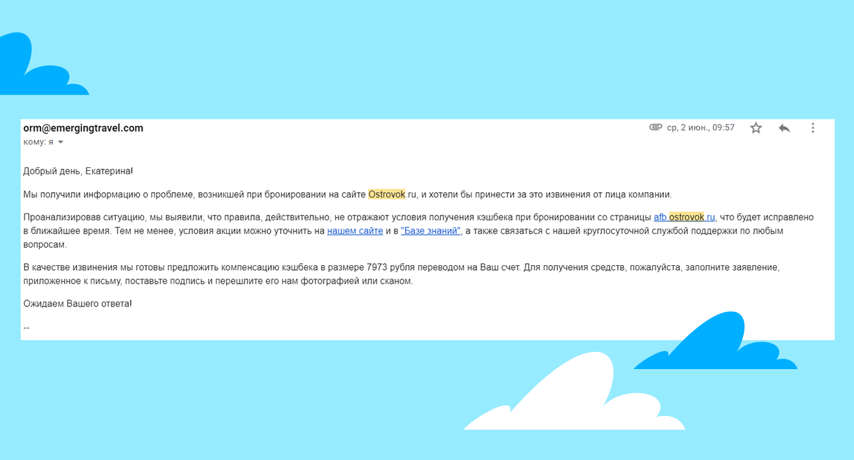 Срок рассмотрения этой заявки составлял один месяц. В моём случае месяц истекал 3 июня. 25 мая я получила ответ, что кэшбэка не будет, потому что я оплатила бронь через страницу afb.ostrovok.ru, а не через ostrovok.ru. При этом нигде на сайте «Островка» таких ограничений не было. Так что я всё сделала верно, но кэшбэк не получила.