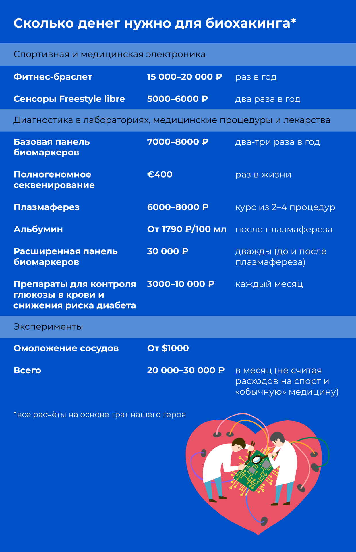 На мой взгляд, в биохакинге деньги хоть и имеют значение, но гораздо важнее мотивация и готовность потратить время. Мы много читаем, анализируем и обсуждаем с друзьями исследования, продумываем эксперименты. До пандемии ездили на научные конференции за свой счёт. Поэтому для комфортного биохакинга нужно около 50 000 ₽ ежемесячно и много времени (я трачу 30–50% от всего своего времени, потому что занимаюсь общественной деятельностью в этом направлении). Причём для обычного биохакинга указанной суммы достаточно, а для экспериментов это нижняя граница. Верхней не существует.