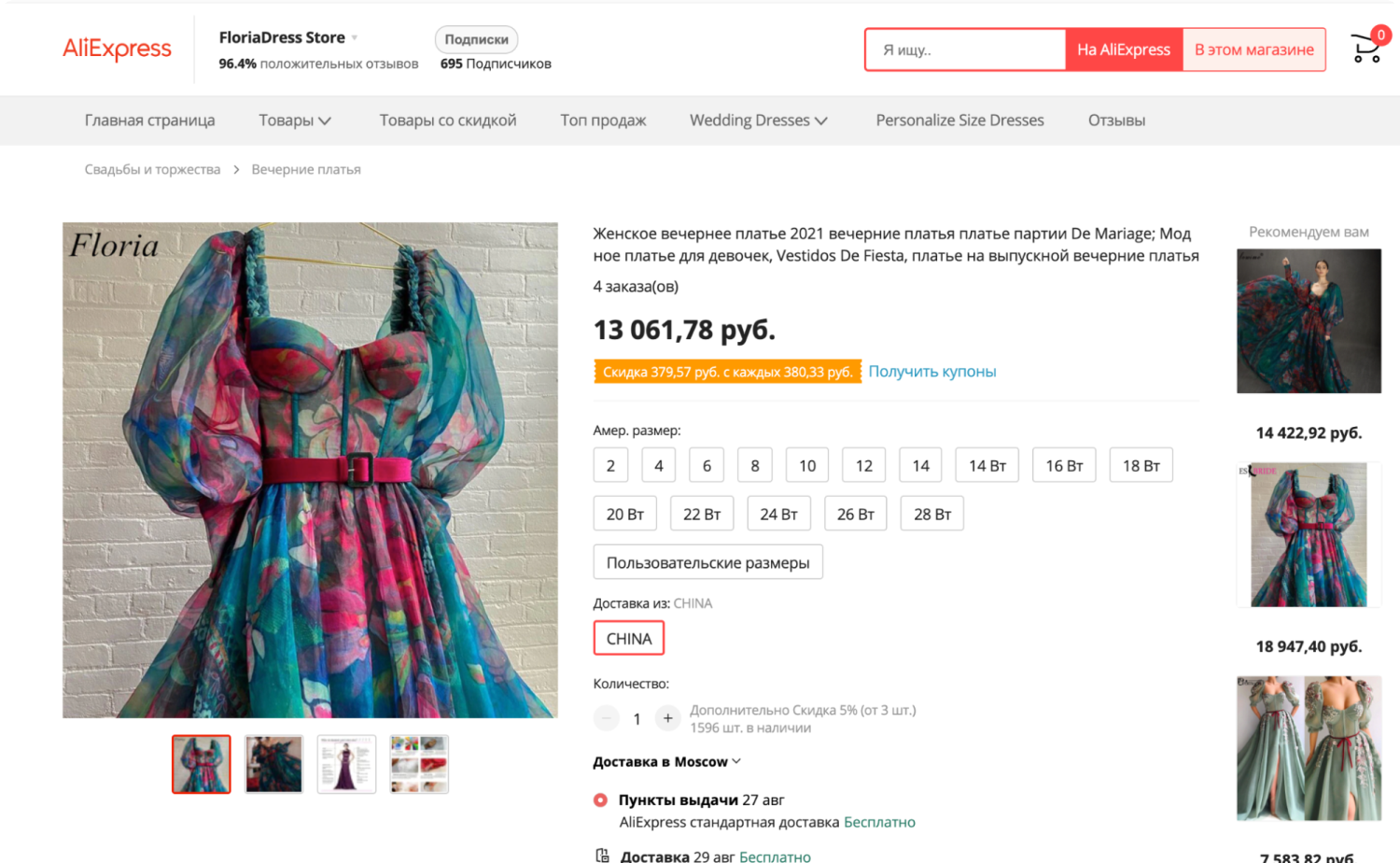 Недавно я увидела в интернете шикарное платье почти за $1400 (100 тысяч ₽). С помощью своей системы подбора я нашла точно такое же на AliExpress за 13 тысяч ₽, при этом продавец отшил его за неделю индивидуально по моим меркам.