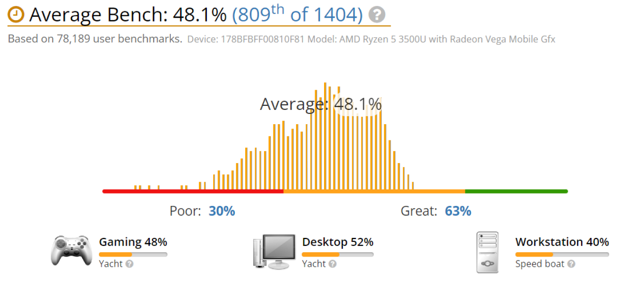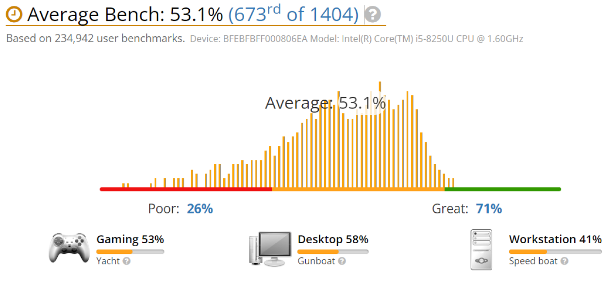 В рейтинге процессоров от UserBenchmark Intel Core i5 8250U занимает 673 место из 1404, показывая производительность в 53,1% от максимальной на рынке: