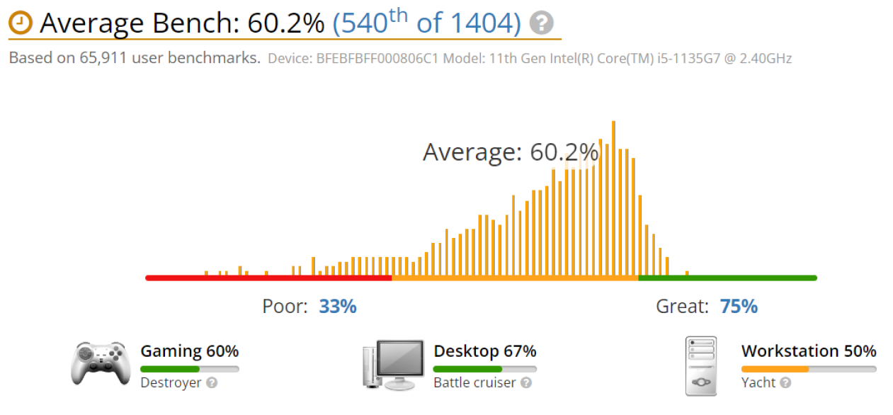 В рейтинге процессоров от UserBenchmark Intel Core i5-1135G7 занимает 540 место из 1404, показывая производительность в 60,2% от максимальной на рынке: