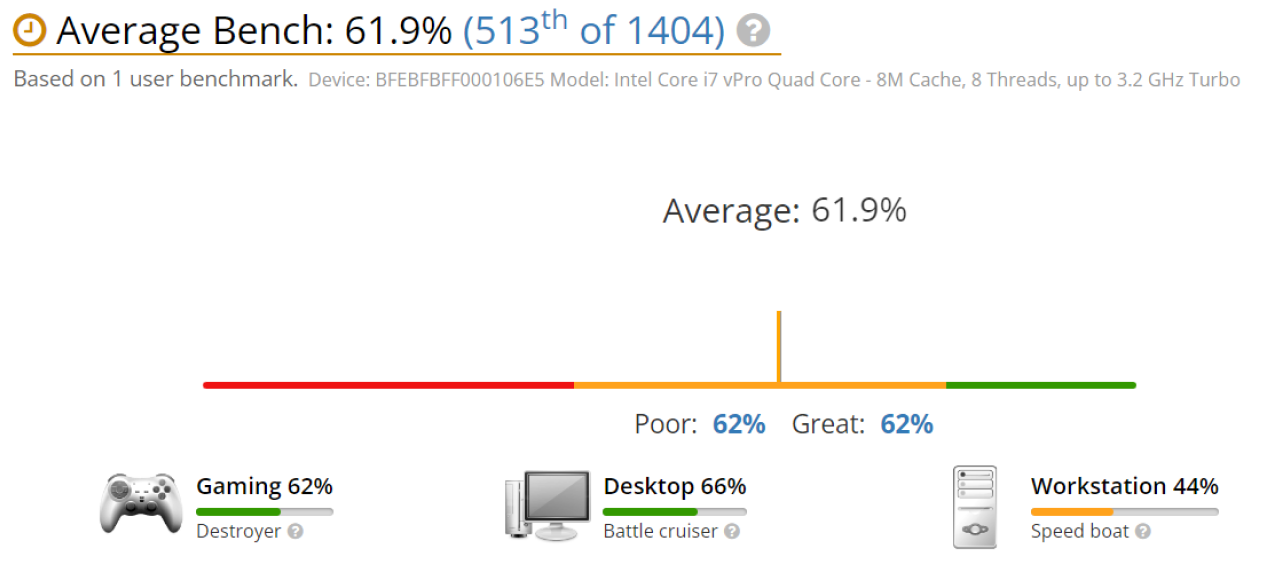 В рейтинге процессоров от UserBenchmark Intel Core i7 vPro Quad Core занимает 513 место из 1404, показывая производительность в 61,9% от максимальной на рынке: