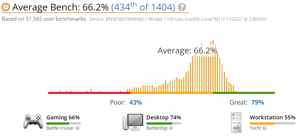 В рейтинге процессоров от UserBenchmark Intel Core i7-1165G7 занимает 434 место из 1404, показывая производительность в 66,2% от максимальной на рынке: