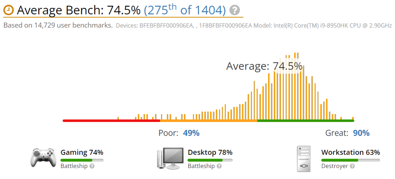 В рейтинге процессоров от UserBenchmark Intel Core i9-8950HK занимает 275 место из 1404, показывая производительность в 74,5% от максимальной на рынке: