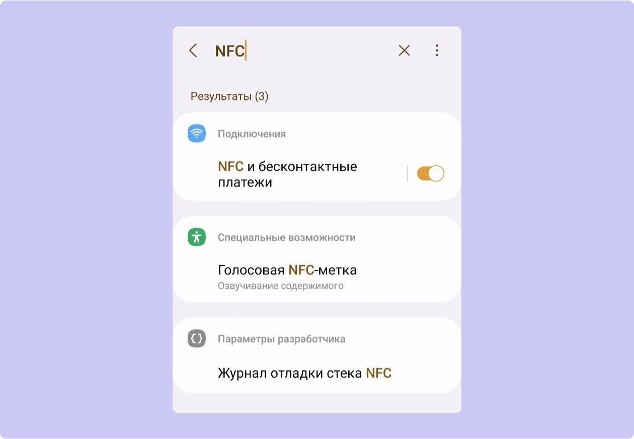Нужно войти в «Настройки» и в поисковой строке ввести «NFC». Если опция есть, но закрыта, требуется передвинуть бегунок вправо, чтобы открыть её.