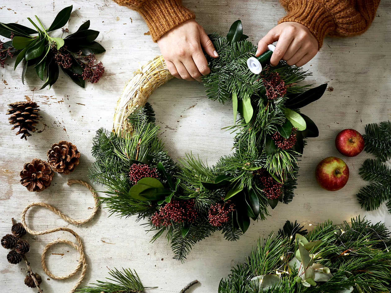 Праздничный венок — традиционное украшение в Рождество и Новый год, которое принято вешать на дверь и стены.