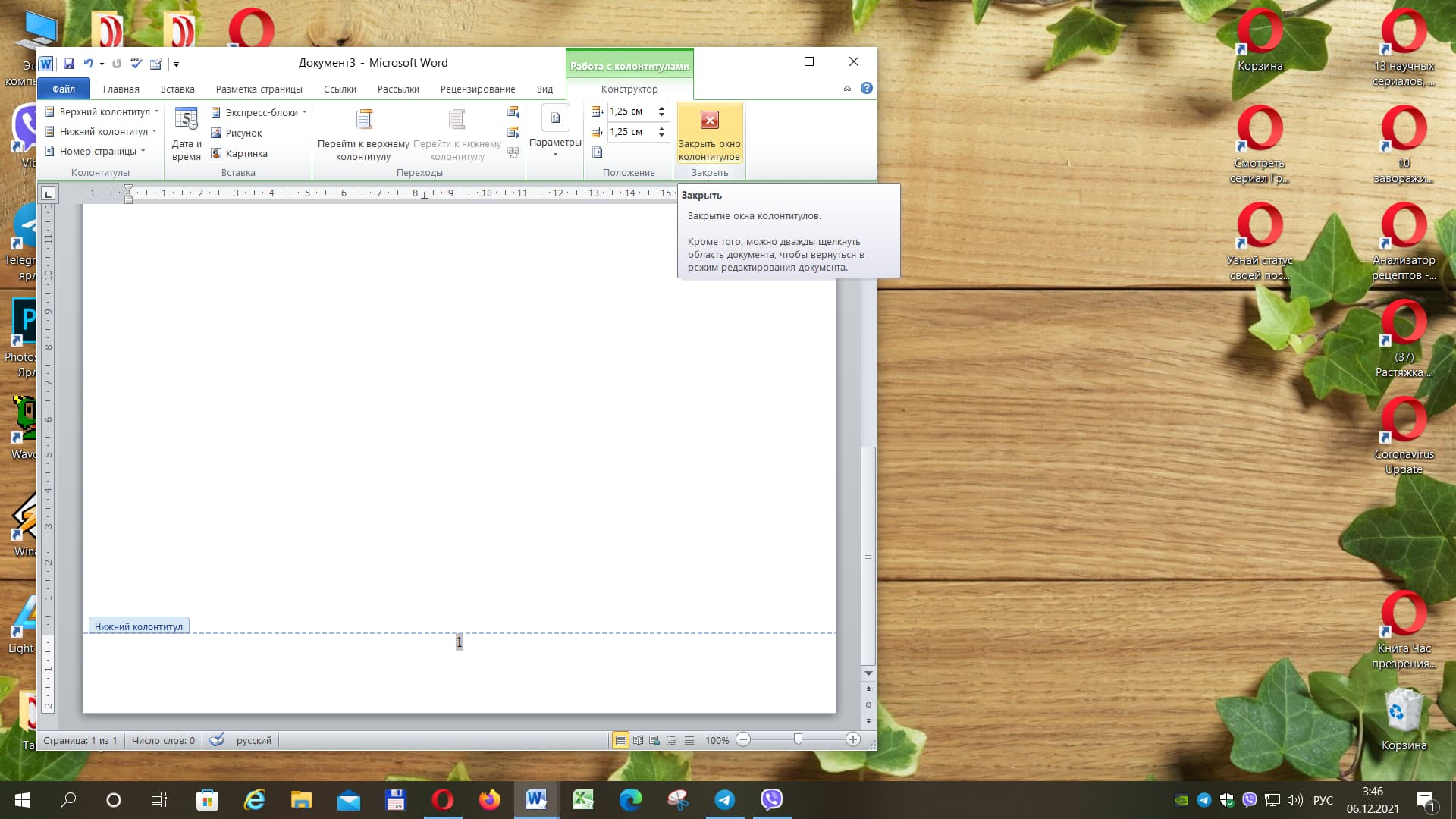 - В документе появятся колонтитулы и вкладка работы с ними. Нажмите на «Закрыть окно колонтитулов». Опять же, левой кнопкой, один раз.