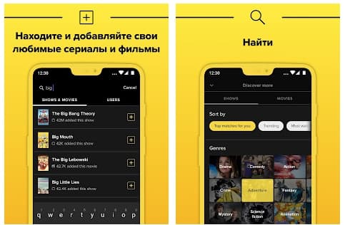 Приложение-афиша. Смотреть фильмы и сериалы через него нельзя, но вы можете добавить в список интересующие вас сериалы или отмечать уже просмотренные серии сериала, чтобы не запутаться и ничего не потерять. Дополнительно вы можете подписаться на выходящие сериалы, и при выходе новой серии приложение будет присылать вам уведомление.